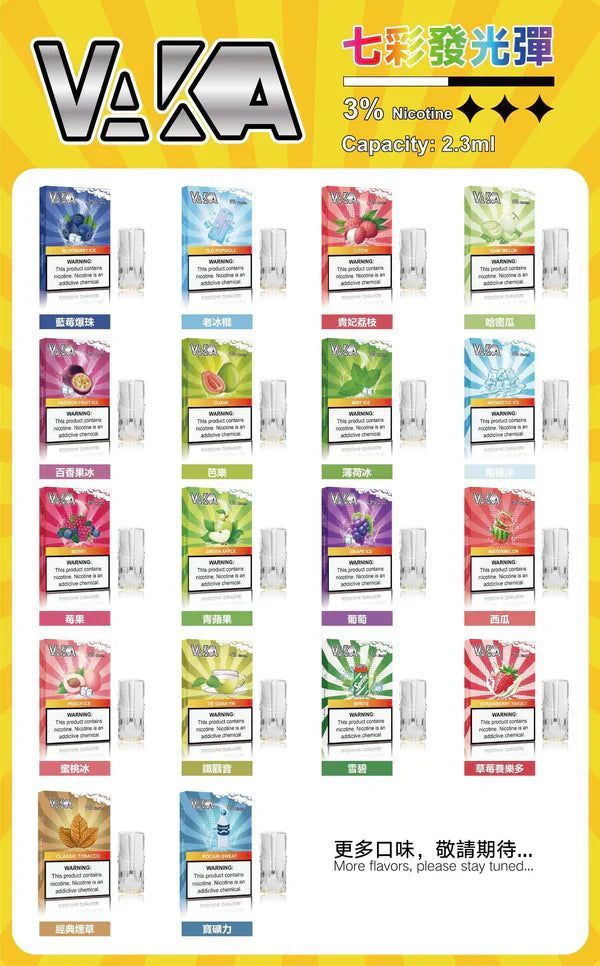 2. 16種多元口味:從經典菸草、清涼薄荷,到果香四溢的芒果、草莓、藍莓,再到獨特的冰鎮西瓜與焦糖瑪奇朵,VAKA一代發光煙彈涵蓋各種風味,滿足不同消費者的味蕾需求,每一口都是新體驗。